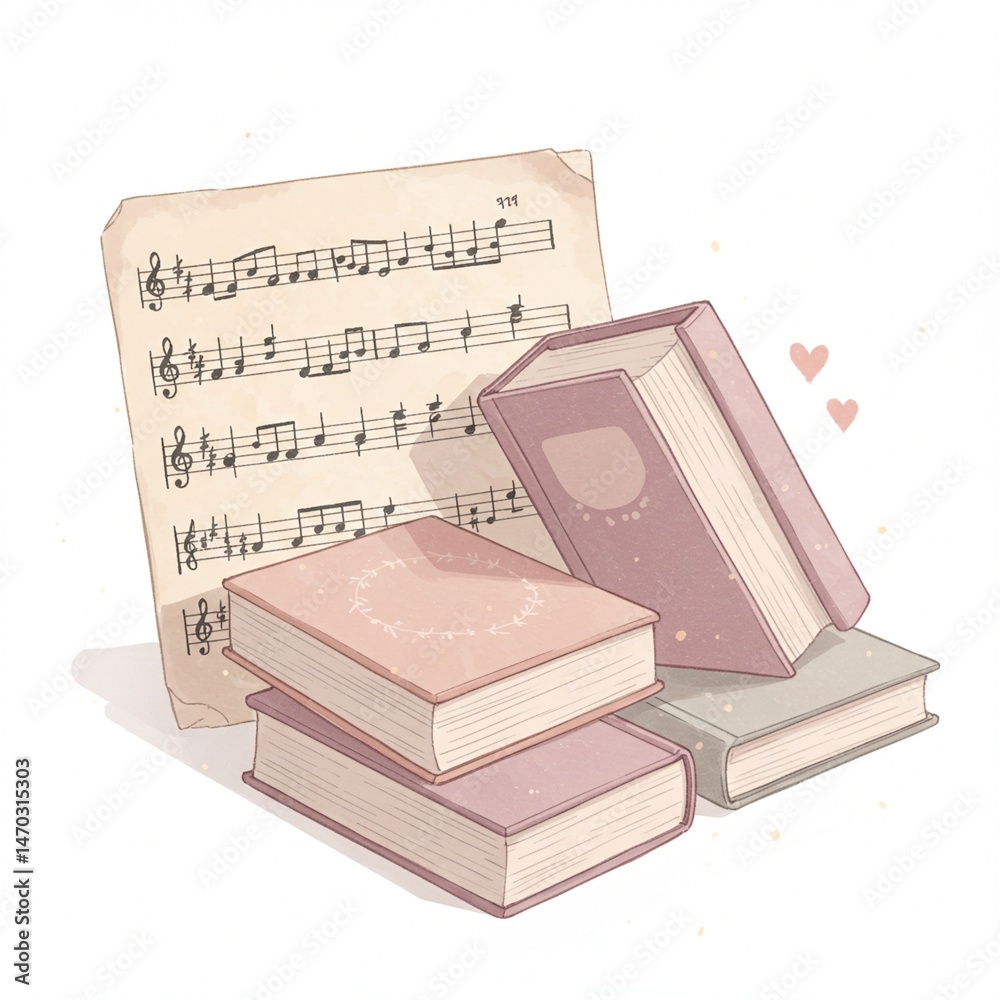 Pastel Book Stack With Vintage Sheet Music Illustration Wallpaper Mural - Decorly Solutions | Decorly Solutions