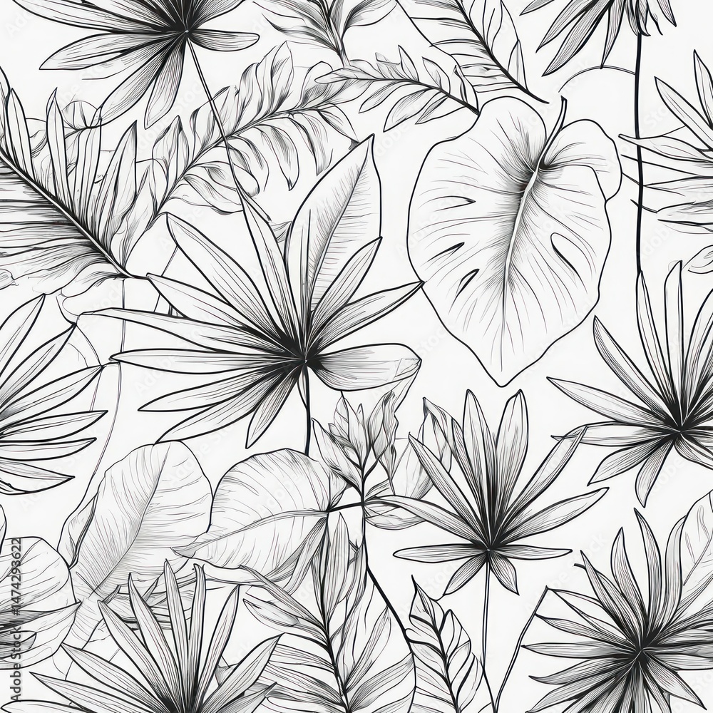 Botanical line art of tropical leaves and flowers in a clean Wallpaper