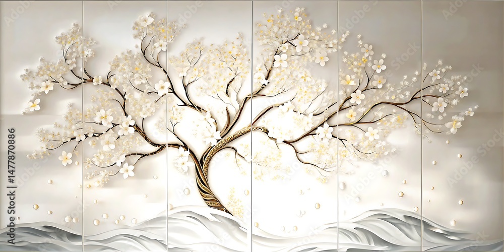 Elegant tree with white blossoms and golden accents creates Wallpaper