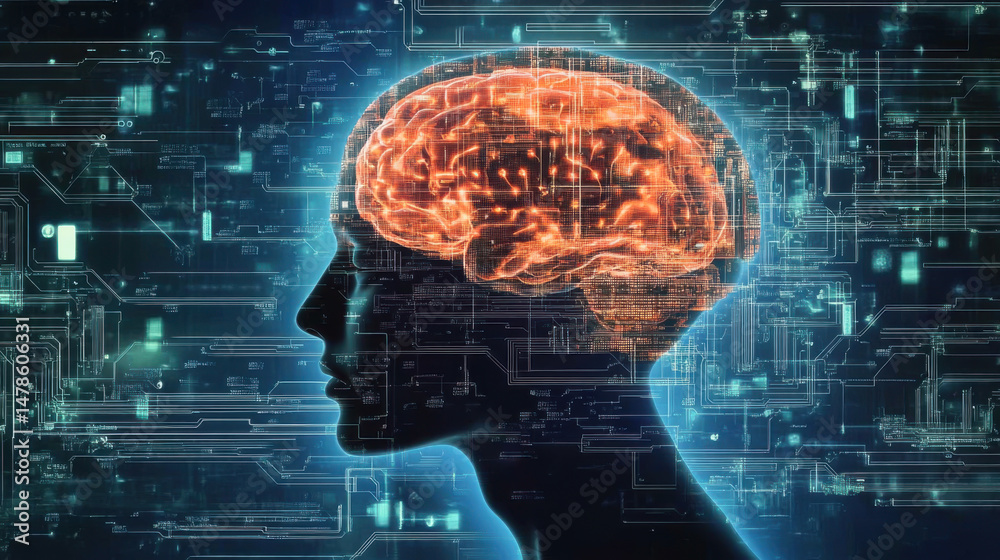 A digital representation of a human head filled with circuit patterns and glowing lights.