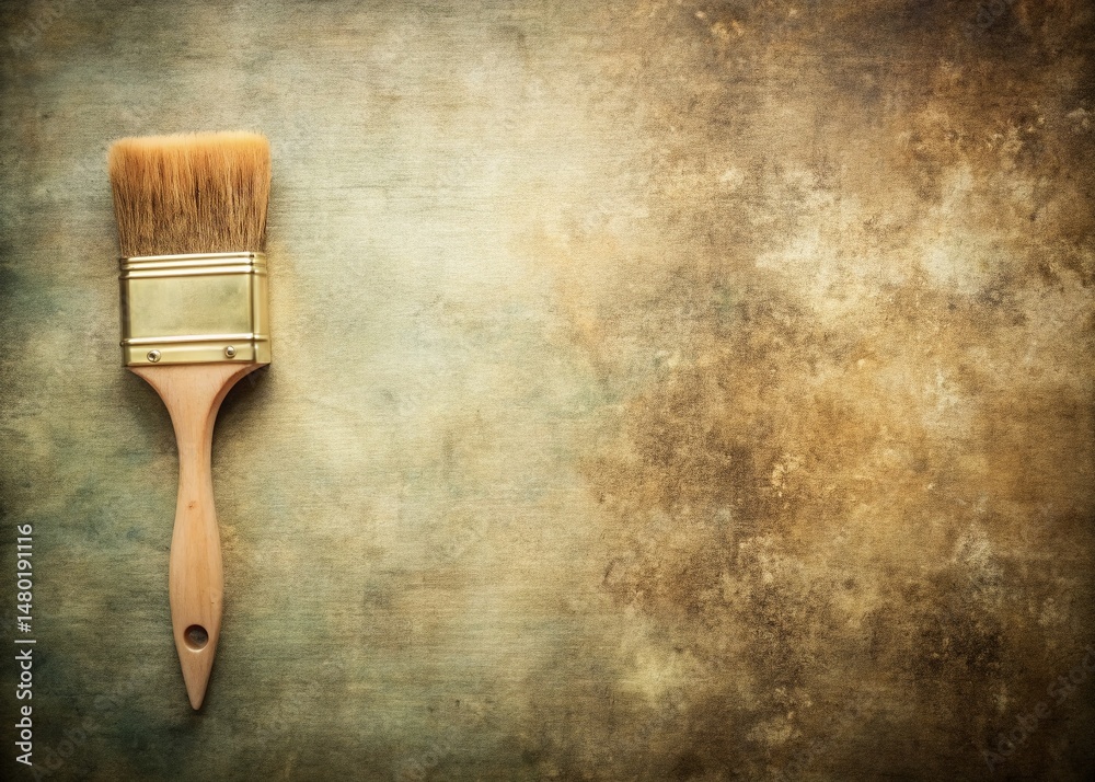 A single paintbrush lies on a textured, light brown surface, with plenty of copy space.