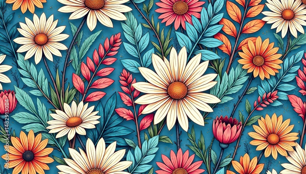 Intricate Line Art Floral Pattern Daisies & Foliage Wallpaper Mural - Decorly Solutions | Decorly Solutions