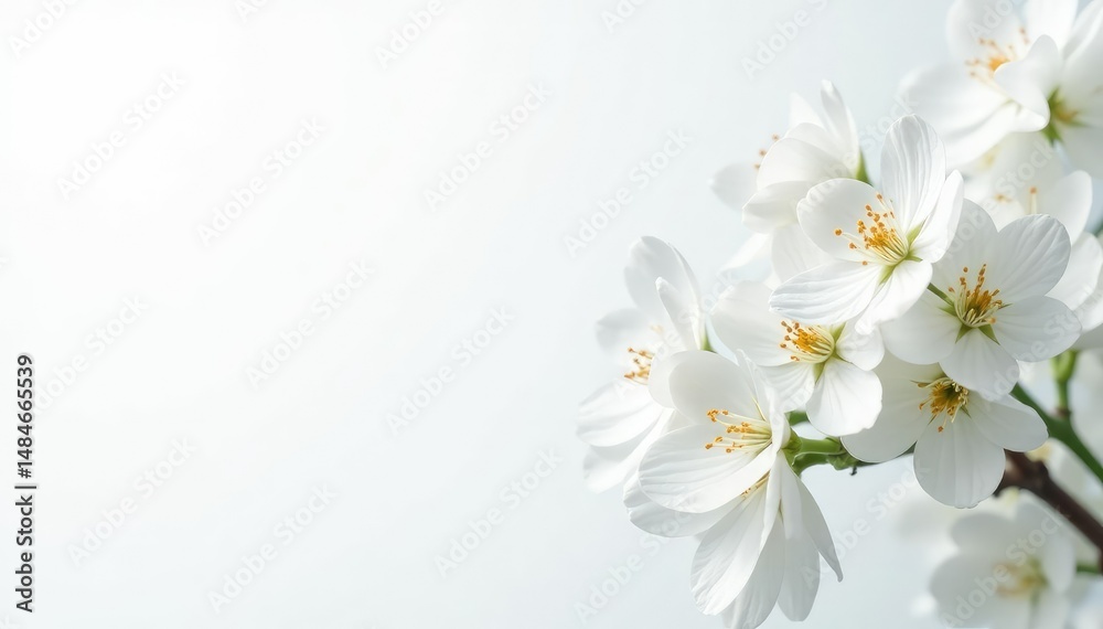 Delicate white flower blossoms against pure white backdrop, design, bright