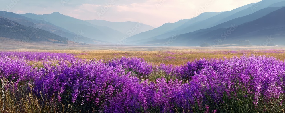 Expansive lavender field in full bloom with rolling mountains in the background, vibrant purple flowers under a clear blue sky, scenic landscape