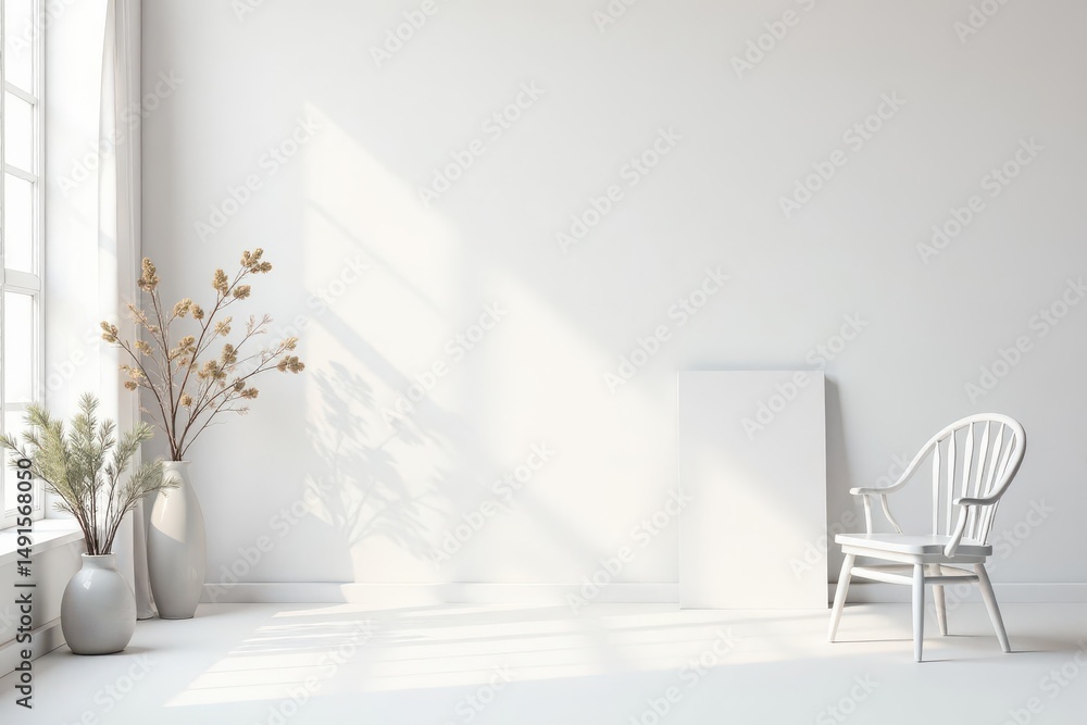 scandinavian interior, minimalistic interior with empty wall, copy space, blank canvas on wall for wall art, mockup template