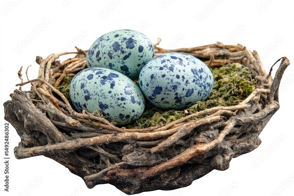 A beautifully crafted nest holds a collection of speckled eggs nestled amidst twigs and moss