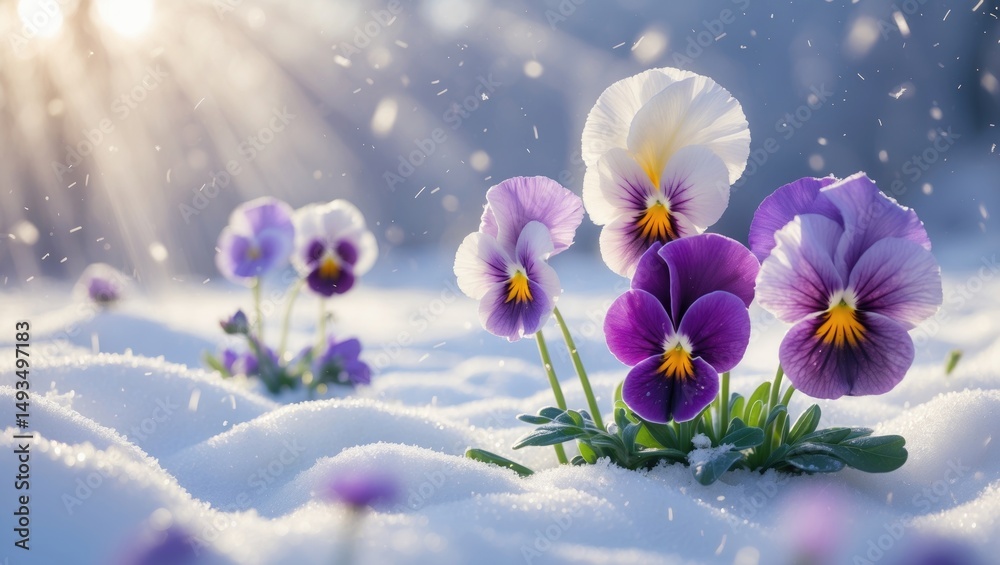Colorful pansy blossoms with horns during springtime in snow Wallpaper
