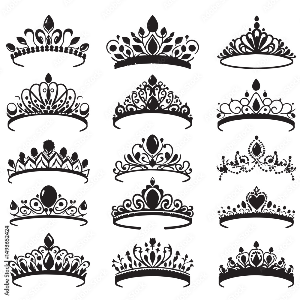 Vector tiara set. Beautiful queen tiaras or princess crown silhouettes for wedding cards and vignettes