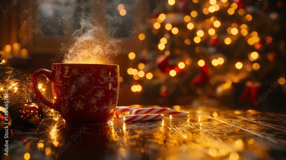 Steaming Drink By Christmas Tree Cozy Warm Festive Wallpaper Mural - Decorly Solutions | Decorly Solutions