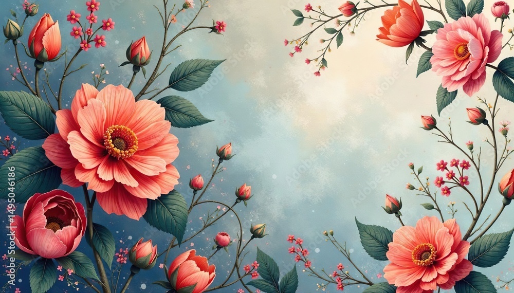 Subtle floral motifs, soft hues, continuous repeat for wall coverings, floral pattern, surface