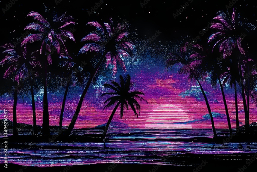 Neon-lit tropical beach at night with two palm trees silhouetted against a purple sky