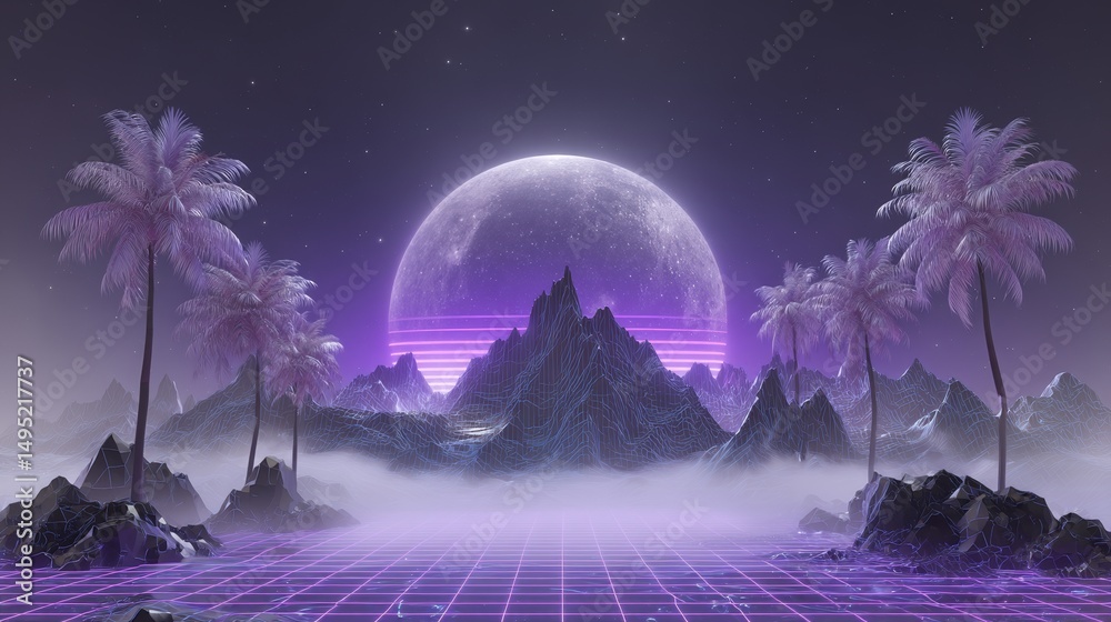 A vibrant sun and mountains are set amidst a retrofuturistic landscape, where a grid pattern covers a flat plane under a star-filled sky with pink and purple clouds