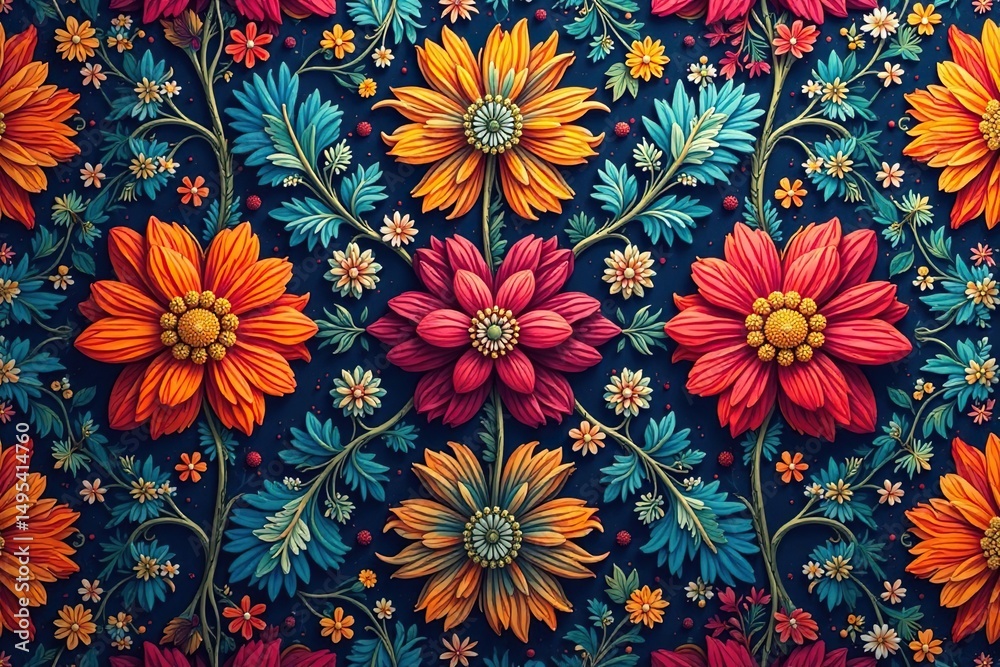 Intricate floral textile design, repeating motif, seamless, leaf