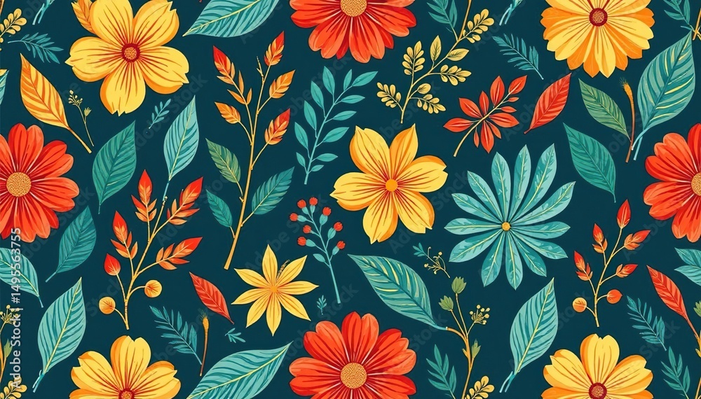Vibrant Floral Composition Bold Colors, Dark Background, Seamless Pattern