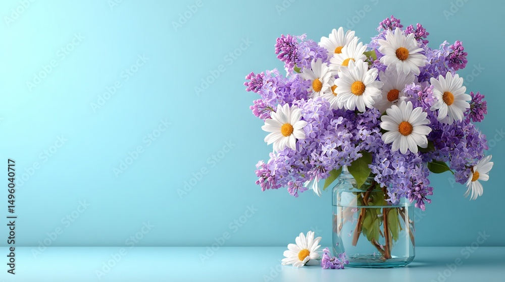 Colorful bouquet of fresh daisies in transparent glass jar on pastel pink and lavender background, vibrant spring floral