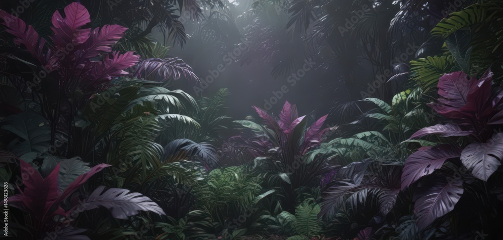 Mysterious Tropical Forest With Colorful Plants and Soft Light in a Serene Landscape.