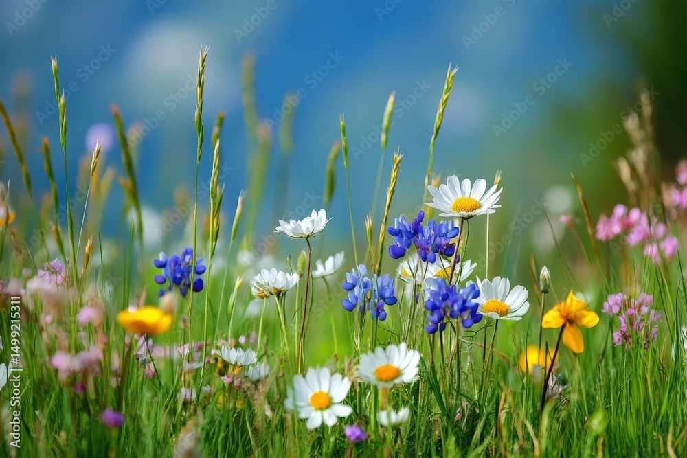 Spring background, wide meadow concept with foreground flowers, sunlight and blue sky