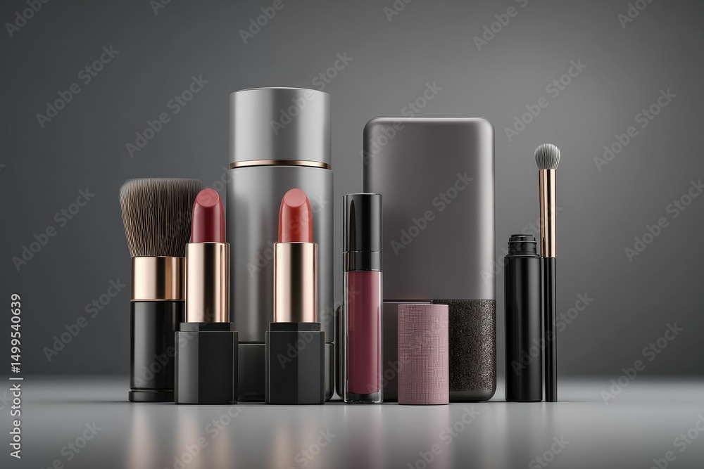 clean image of essential daily makeup products with ample copy space includes foundation lipstick and mascara arranged