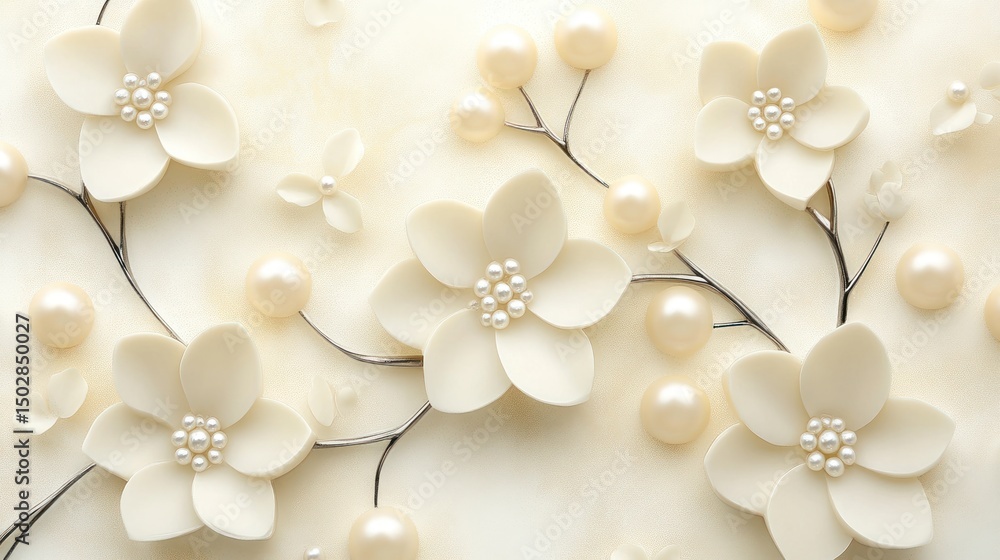 Elegant white flowers and pearls arranged on a light backgro Wallpaper