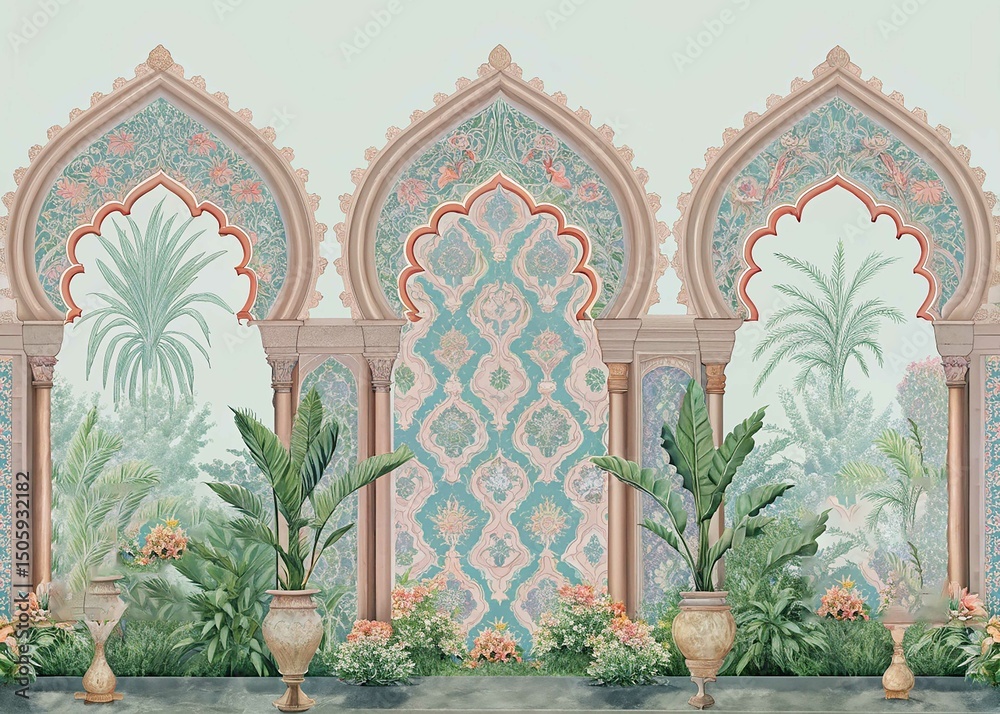 Three Patterned Arches Frame Lush Plant Life Creating Wallpaper Mural - Decorly Solutions | Decorly Solutions