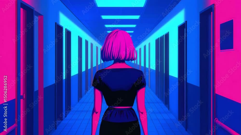 Woman With Pink Hair Walking Down A Neon Wallpaper Mural - Decorly Solutions | Decorly Solutions