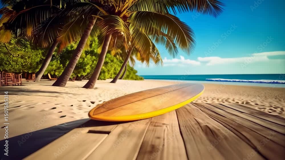 Wooden Surfboard Rests On Planks Overlooking Sunny Tropical Wallpaper Mural - Decorly Solutions | Decorly Solutions