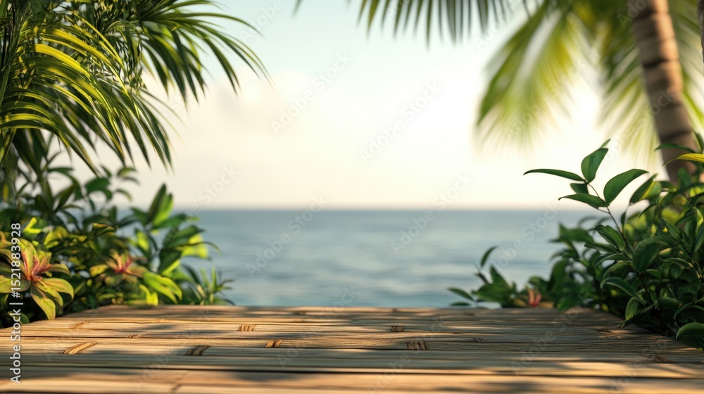 On an island during sunset, a wooden table is surrounded by palm trees and the sea, creating a relaxing atmosphere for product display Stocks