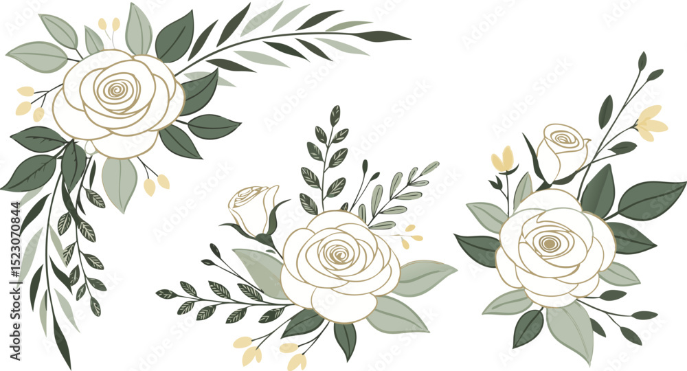 Set of floral branch. Flower pink rose, green leaves. Wedding concept with flowers. Floral poster, invite. Vector arrangements for greeting card.