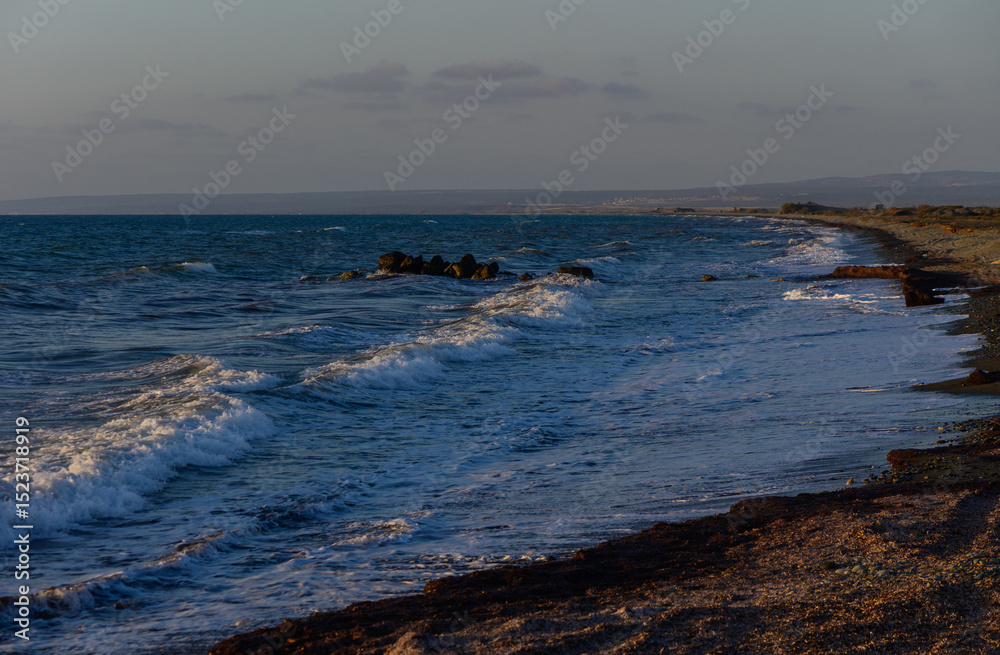 A serene coastal view of calm blue waves lapping against rocky shores in the golden hour light.