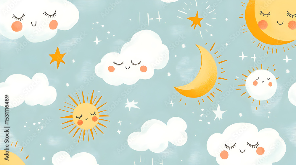 Bright and cheerful pattern of suns and clouds on a teal background.