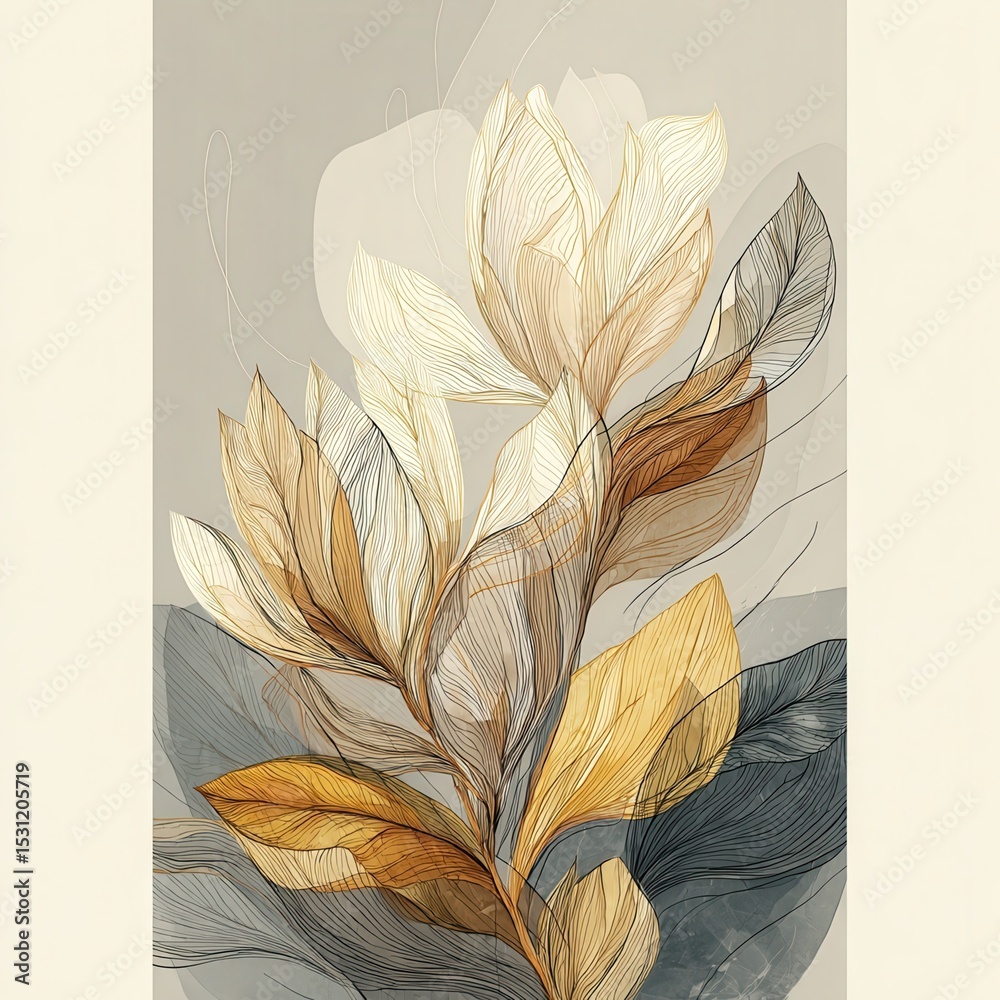 Vibrant Floral Illustration: Modern Botanical Design with Colorful Leaves and Petals for Creative Wallpaper