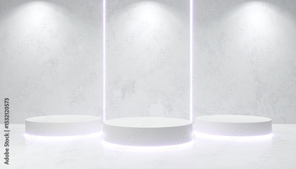 Showroom with a wall with lighting and a cylinder pedestal with lighting for the product. Concept of space for product promotional sales presentation.