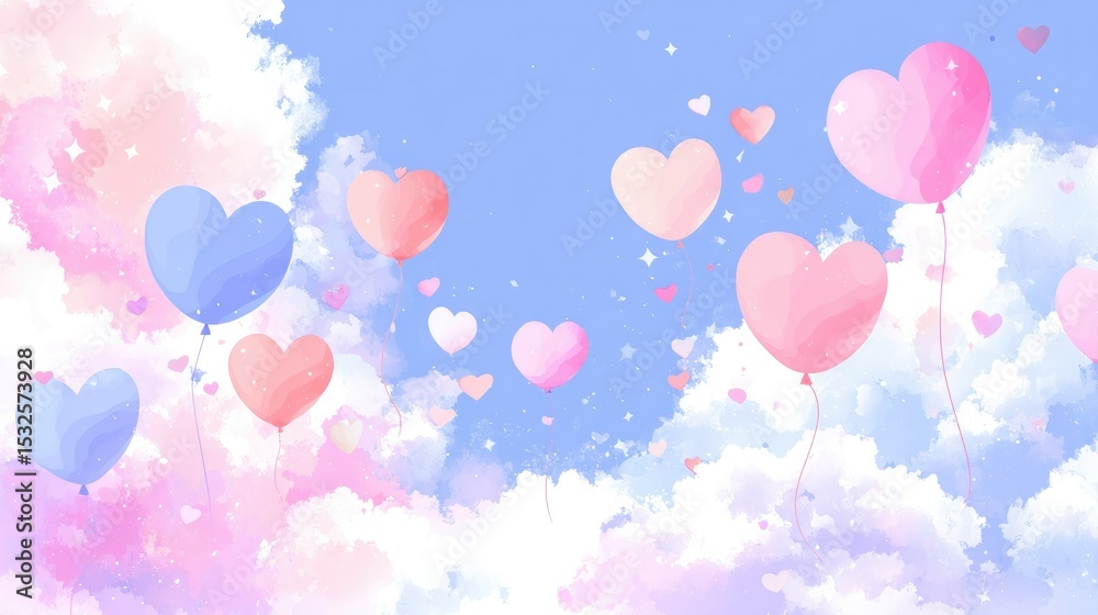 Heart-shaped balloons floating on a soft sky-blue background with clouds.