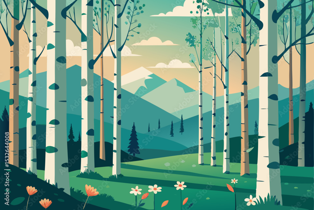 Stylized Landscape Illustration with Evergreen Trees Power Lines Distant City and Mountains in a Flat Design with a Limited Palette of Greens and Blues for