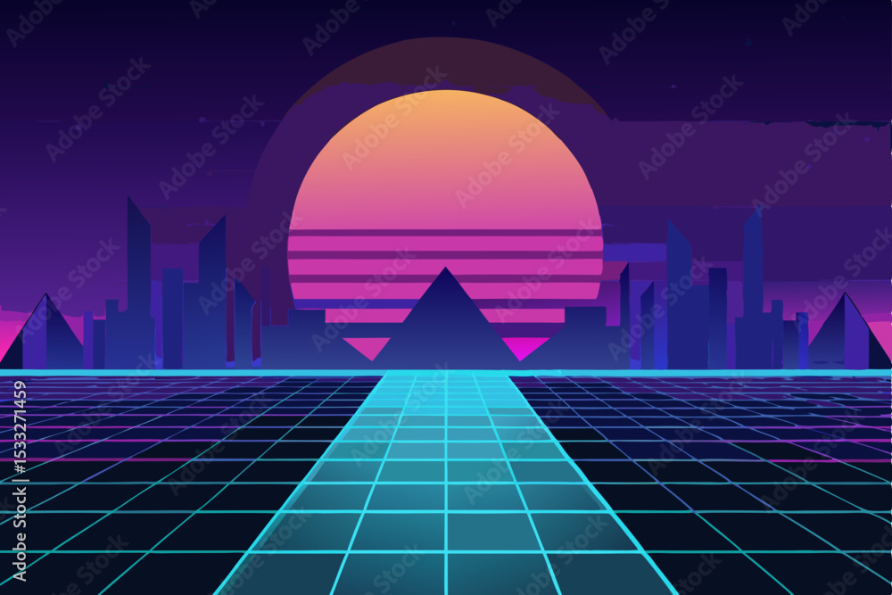 Vector art of retro cityscape illustration with neon lights and a grid floor, reminiscent of 1980s aesthetics and futuristic themes