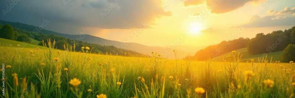 Soft focus sunset over lush green meadow, sweet tones , romantic, detail