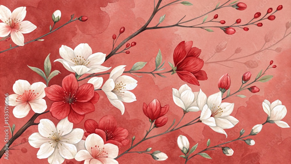 Red and White Watercolor Floral Branch Composition Botanical Wallpaper