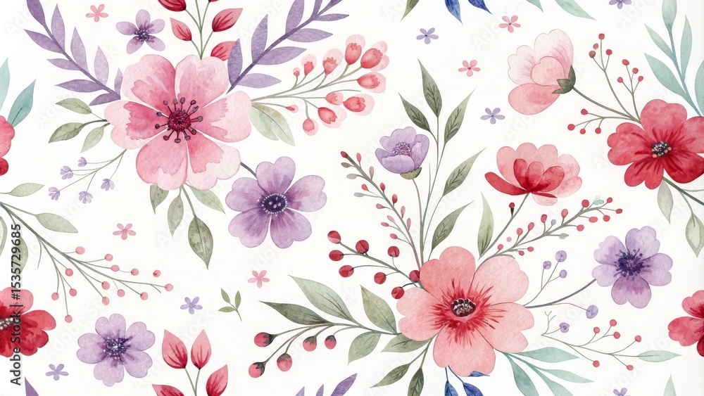 Watercolor Floral Seamless Pattern Pink Purple Flowers Leave Wallpaper