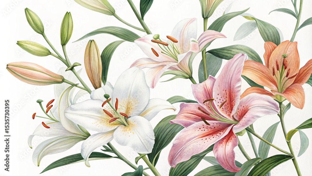 Watercolor Lilies Botanical Composition Of White Pink And Wallpaper Mural - Decorly Solutions | Decorly Solutions