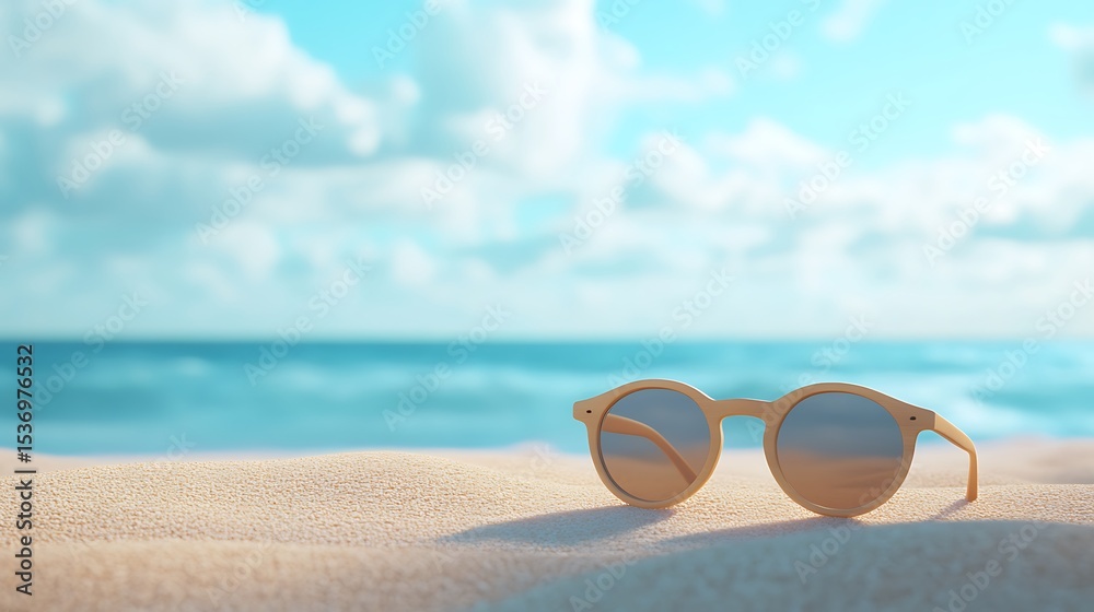 A close-up of a pair of stylish sunglasses on a sandy beach with turquoise water in the background, symbolizing summer, travel, and outdoor lifestyle, perfect for vacation and fashion content