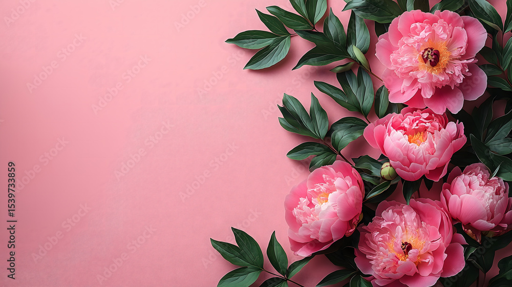 Full bloom vibrant pink peonies with rich green leaves artfully arranged on a complementary pink backdrop, emanating romance