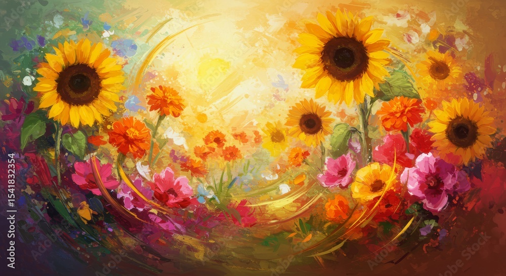 Vibrant floral painting with sunflowers and colorful blossom Wallpaper