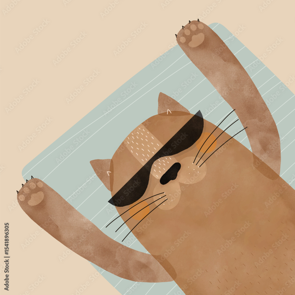 Brown Cat Wearing Sunglasses Sunbathing While Lying On A Blu Wallpaper