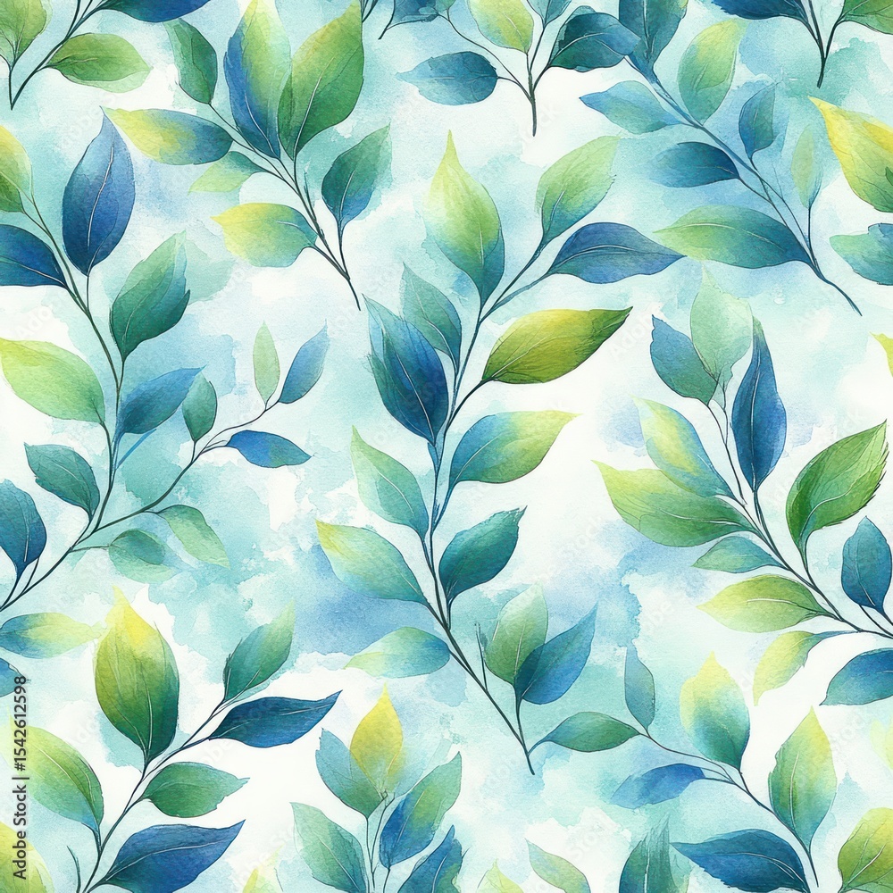 Seamless Pattern Of Watercolor Green And Blue Leaves Wallpaper Mural - Decorly Solutions | Decorly Solutions