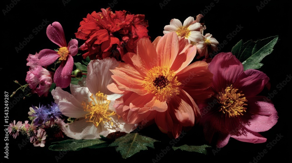 Colorful Floral Arrangement Featuring Various Flowers And Foliage On A Dark Background