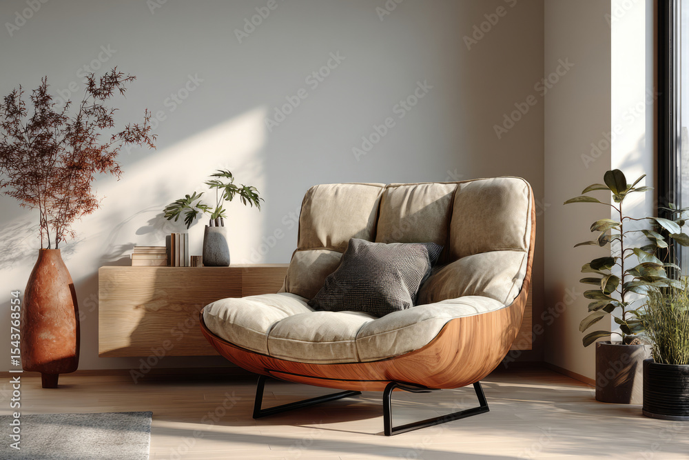 Cozy minimalist living room with wood accent chair and plant Wallpaper