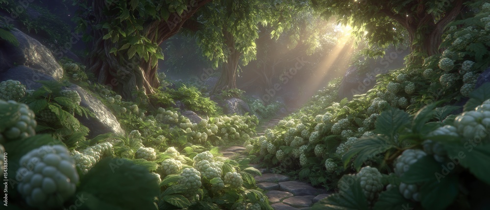Magical Forest with Sunlight and Blooming Flowers