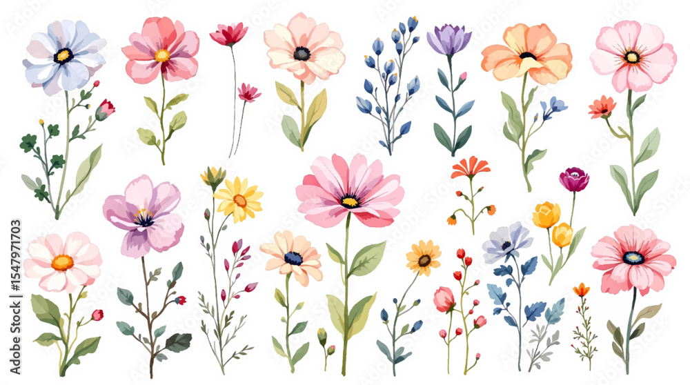 Colorful spring flowers, Set of watercolor flowers, Clipart watercolor flowers