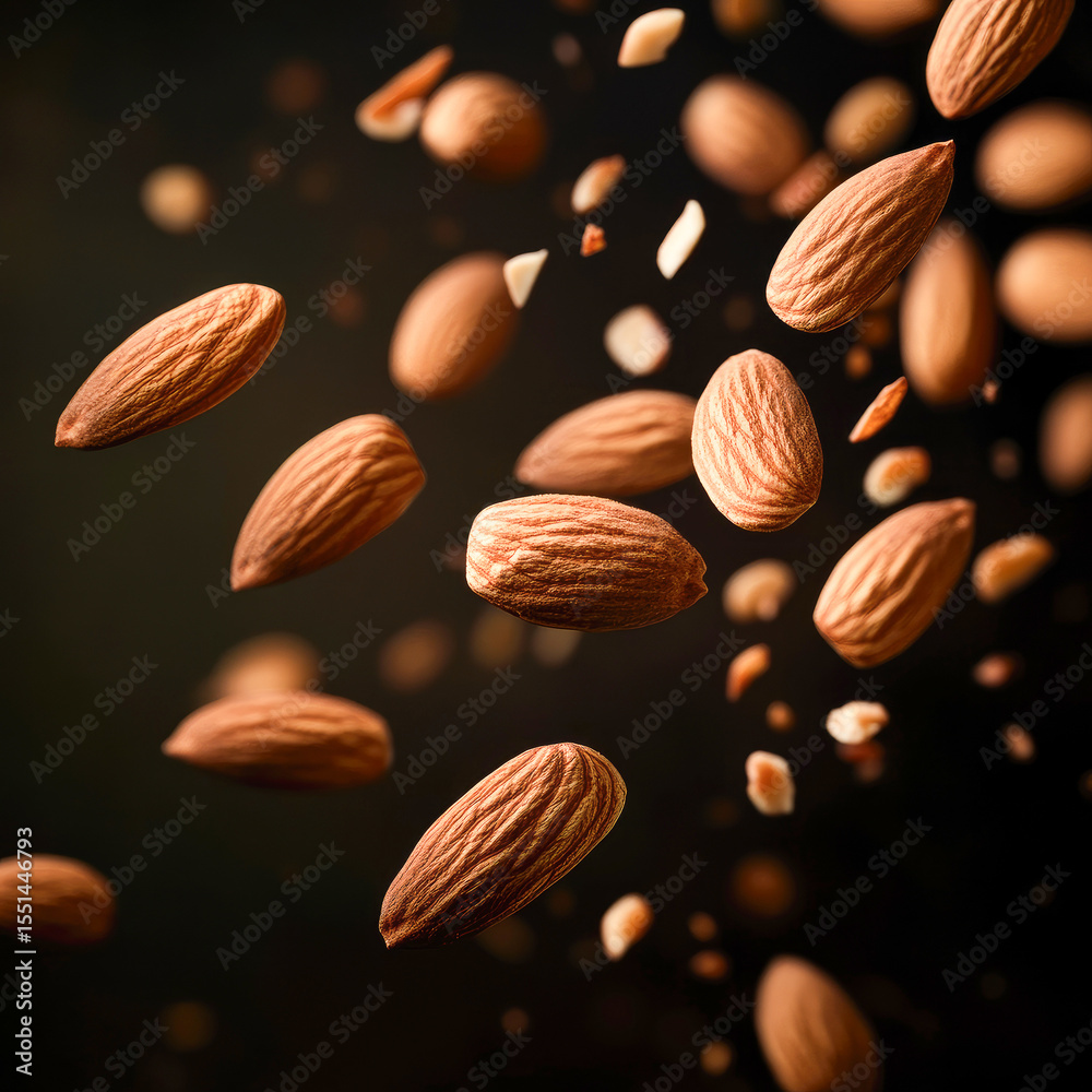 Several almonds in sharp focus, suspended against a dark background, showcasing their texture and subtle variations in color