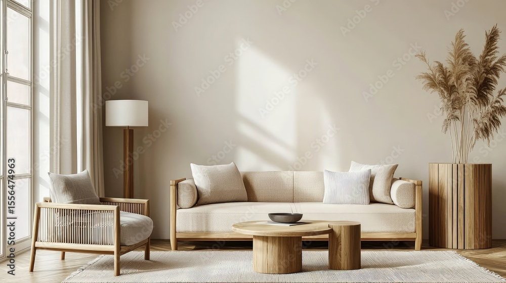 Soft Neutral-toned Modern Living Room With Wooden Furniture Wallpaper Mural - Decorly Solutions | Decorly Solutions